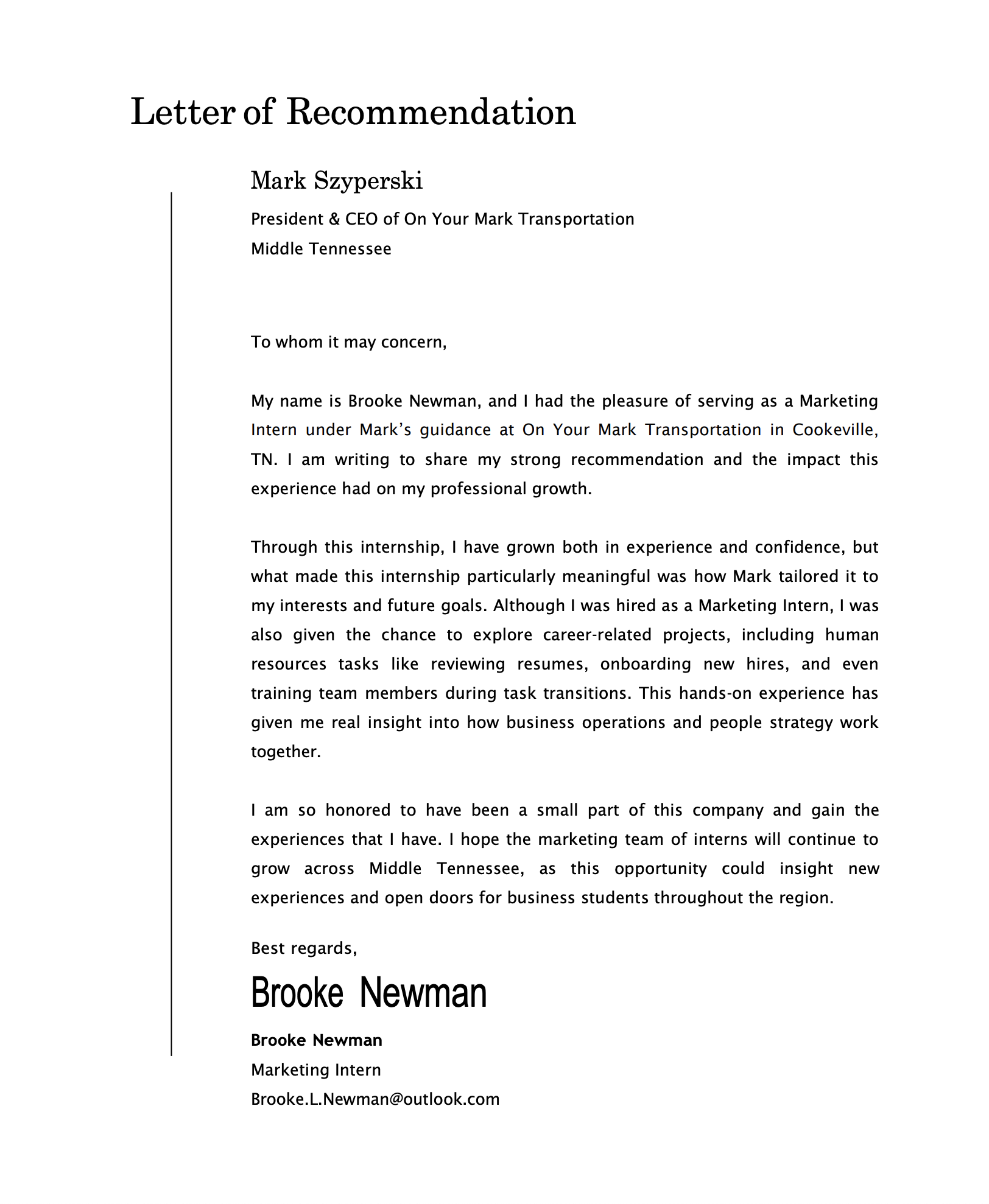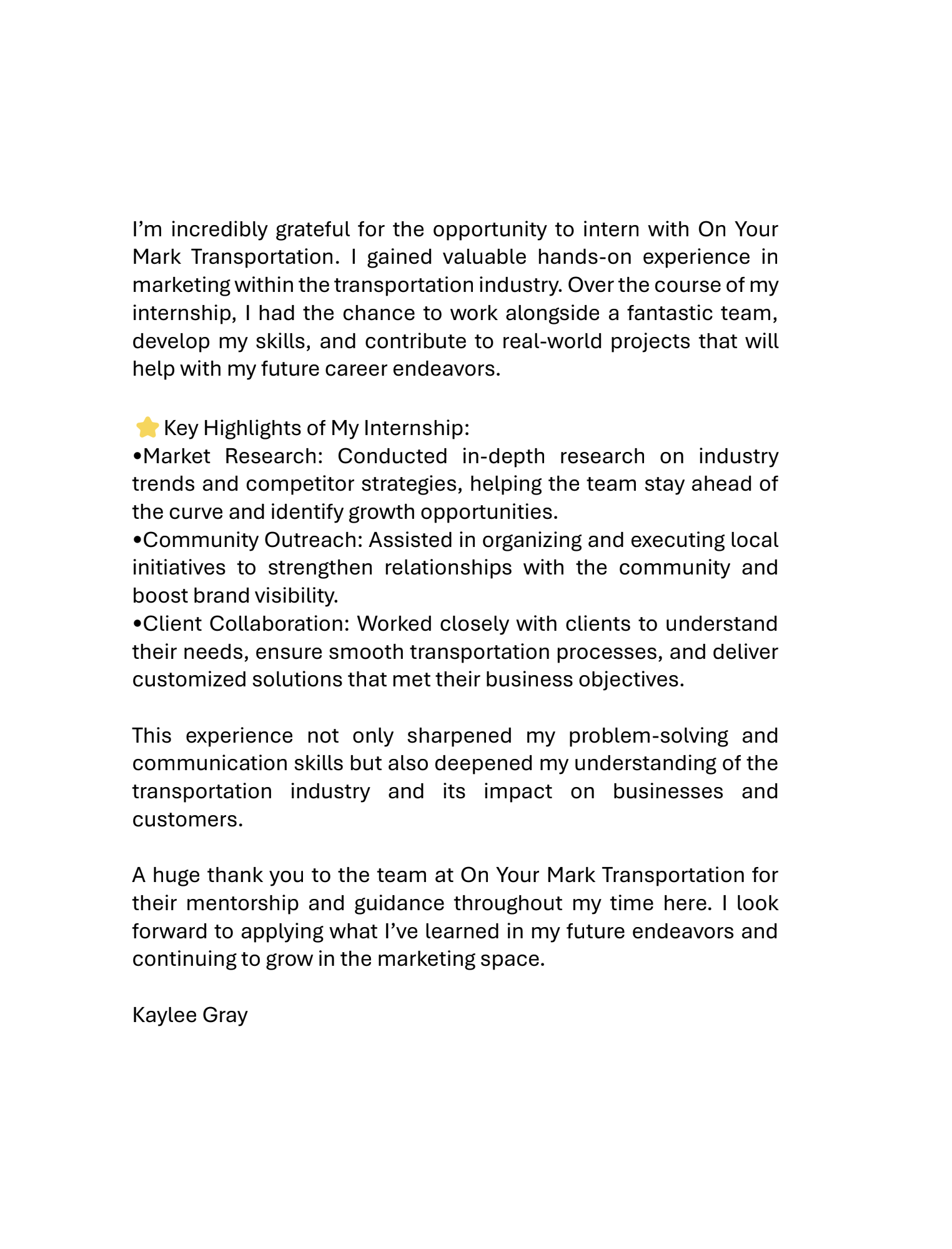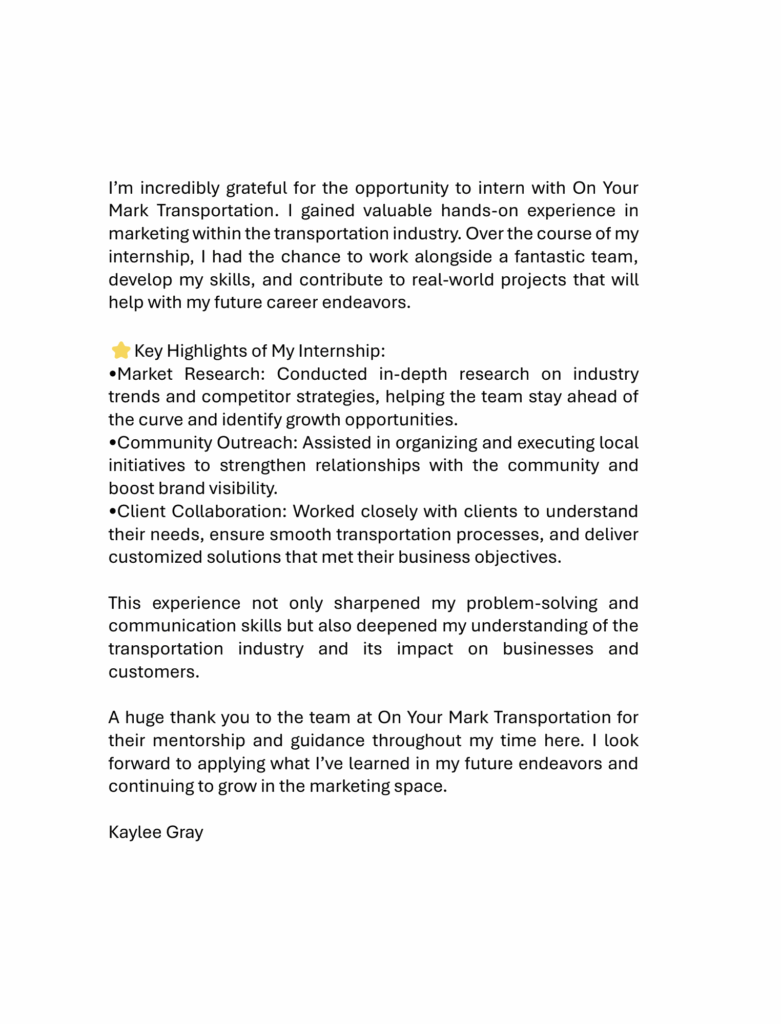 “I wanted to say thank you again for this incredible opportunity! I have REALLY enjoyed my time working with you. You have taught me a lot, and you have truly been amazing.  Good luck with everything and THANK YOU!”